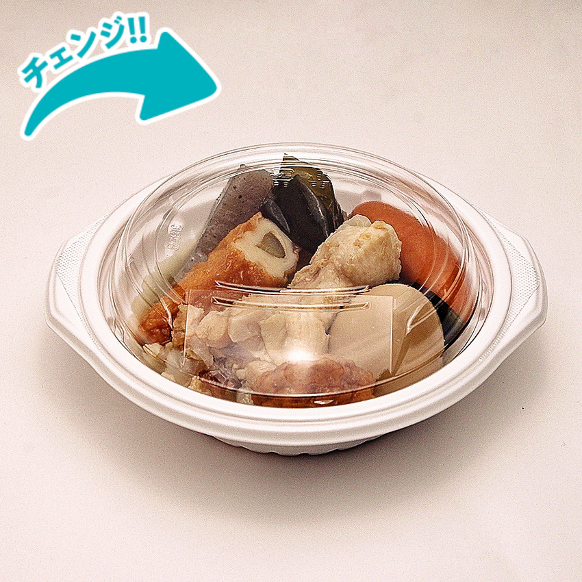 鍋型のフォルムが家庭的な温かさを演出し、おでんの美味しさを視覚から引き立てる容器シリーズです。光沢感のある質感で具材を美しく見せ、耐熱105℃まで電子レンジOK。内嵌合蓋で汁漏れしにくく、断熱性と耐油性にも優れた使いやすい容器です。
