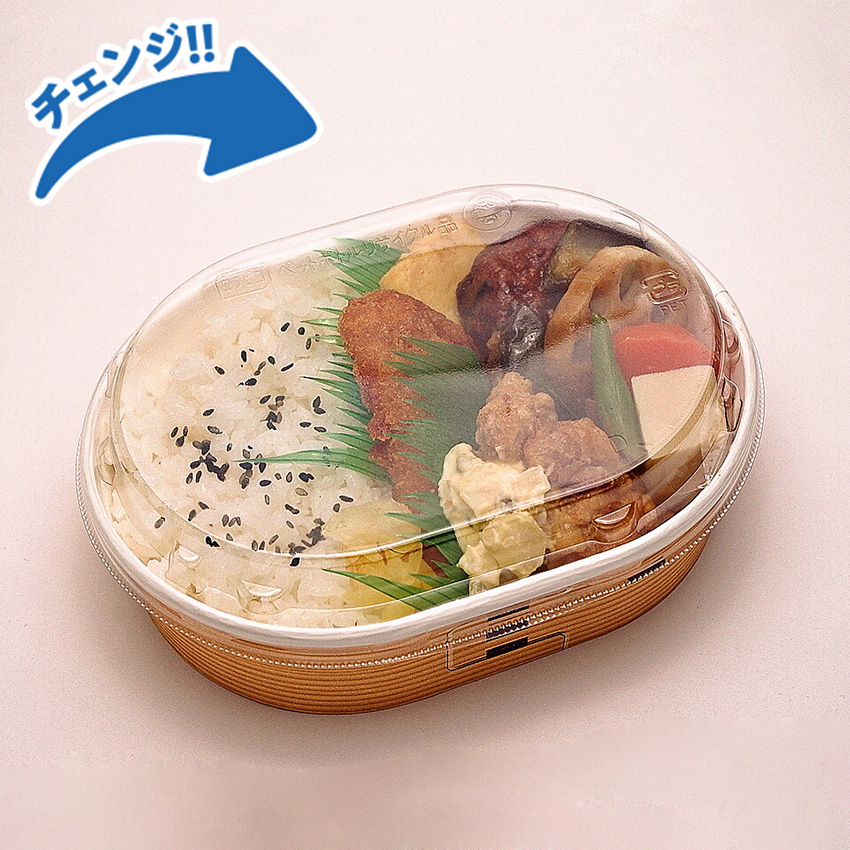 定番スタイルとは趣を変え、「カフェ」や「デリバリー」を意識したカジュアルスタイルなご提案です。容量は一般的な弁当容器よりやや小ぶり。女性も手に取りやすく、うれしいコンパクトサイズです。デザインはどこか懐かしさを感じさせ、幕の内弁当のレトロな魅力をより一層引き立てます。さらに、冷凍・電子レンジの両方に対応している点も大きな特長です。店頭販売はもちろん、テイクアウトやデリバリー、作り置きなど、さまざまな販売形態に柔軟に対応できる容器です。