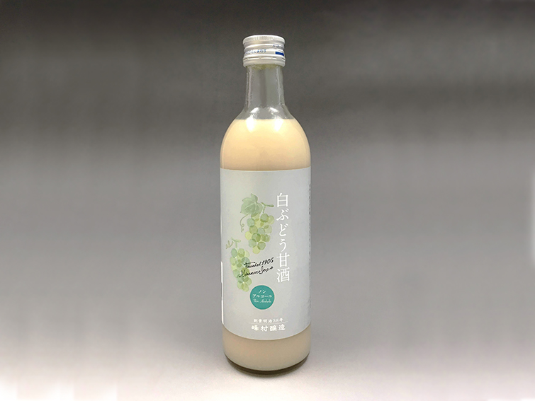 創業明治38年から越後味噌を作り続ける峰村醸造様のオリジナル商品、甘酒と白ぶどう果汁をミックスしたノンアルコールの甘酒飲料「白ぶどう甘酒」のラベルデザインをお手伝いさせていただきました。